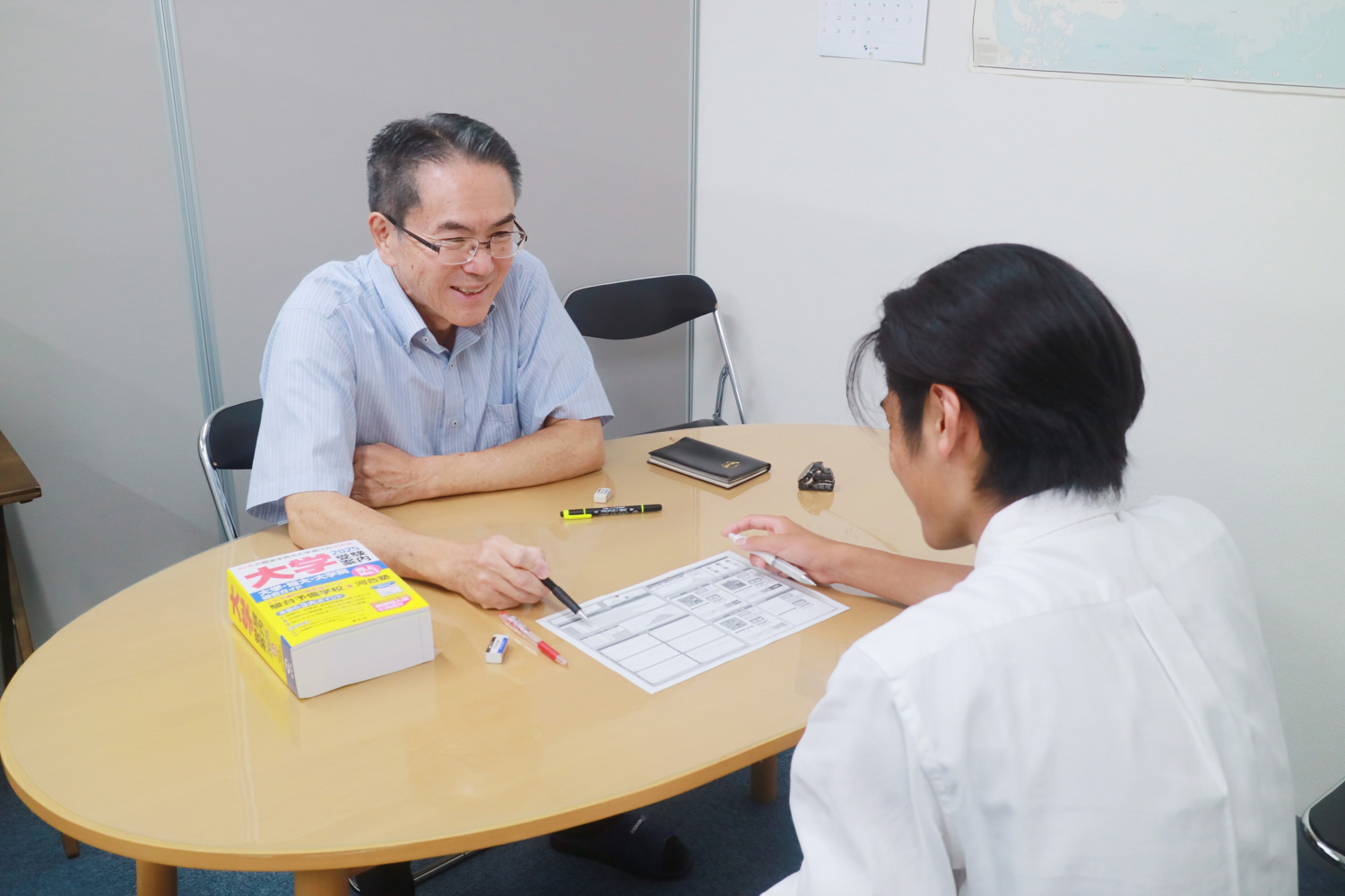 何故勉強するのかを分かり易く話します。全国模試後の面談(高校クラス)、定期テスト後の面談(中学クラス)で一人一人と対話します。特に高校生との面談では勉強法や進路についてとことん相談します。